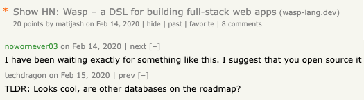 Our next milestone was to launch Wasp on Hacker News, but this time “officially” as a YC-backed company. Hacker News provides a lot of good tips on how to successfully launch and 80% of the advice applies even if your product isn’t backed by YC. I wish I had known about it before. The gist of the advice is to write in a clear and succinct way and to avoid buzzwords, superlatives, and salesy tone above all. Consider HN readers as your peers and explain what you do in a way you would talk to a friend over a drink. It really works that way.